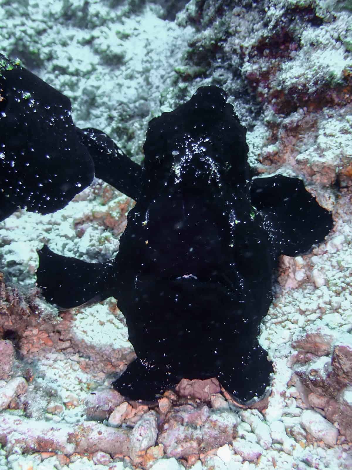 Last week we found three black Giant Frogfishes in Gili Air at our popular dive site ‘Bounty’. This time in almost black with a few white dots. They are really well camouflaged and hard to find because they adapt perfectly to their surroundings and move very little. Frogfishes are unable to change their colour quickly, the whole process of changing colour to blend in can take several weeks. And they really nearly don’t move. If they do, they use their fins to walk across the bottom or swim by jet propulsion. Their backward-facing, tubelike gill openings propel them along the bottom if they want to move really quickly.