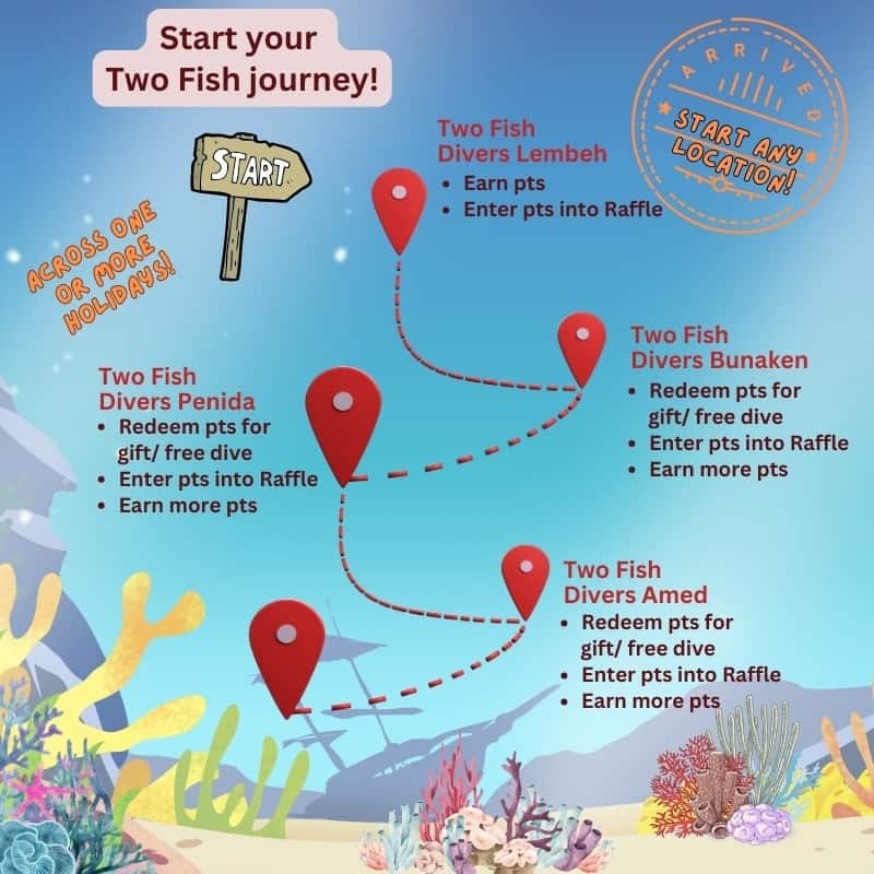 As an example, if you did the OWC course and 6 fun dives in Two Fish Bunaken you would earn 10pts (4 for the OWC and 6 for the fun dives), and if you visited another location such as Two Fish Penida you could redeem these points for 1 fun dive!!